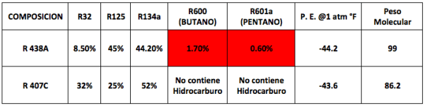 En la siguiente tabla podemos ver las características ambientales y capacidades del refrigerante, en este caso el R 438A, contiene % de refrigerante “Hidrocarburo”