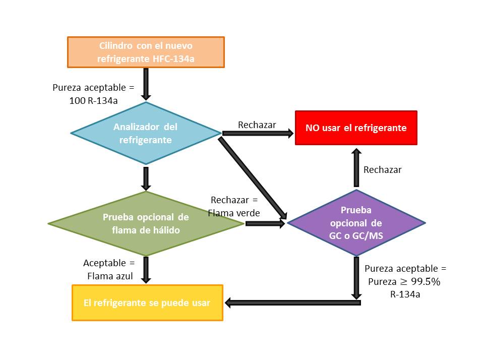 El diagrama de abajo indica el proceso para determinar si los contenedores del gas R-134a podrían tener porciones considerables de contaminantes refrigerantes: