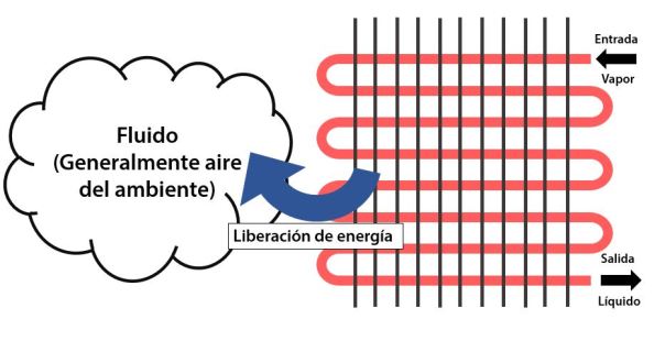 En el condensador, la operación es justamente contraía a la del evaporador. El vapor de refrigerante entra al condensador después de ser comprimido por el compresor a una alta presión y elevada temperatura, permitiendo el intercambio de calor con el aire, agua de proceso o con cualquier fluido. Esto logra el calor que absorbió del evaporador sea cedido al medio ambiente (o cualquier otro fluido). En el proceso de condensación, el refrigerante cambia de vapor a líquido saturado o líquido sub-enfriado, a fin de que se mantenga en fase líquida en su camino de retorno al evaporador.