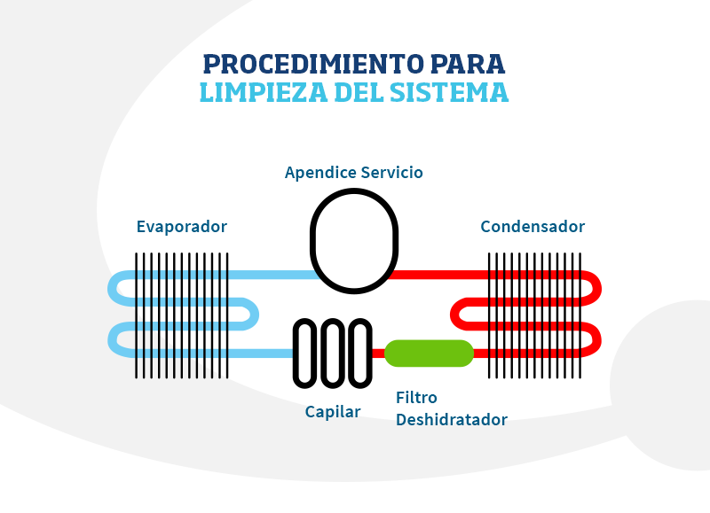 - Realizar la limpieza procurando retirar el compresor, el filtro deshidratador y el capilar o VTE.
