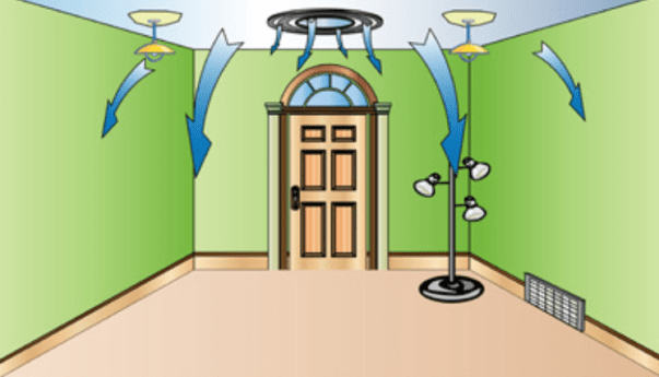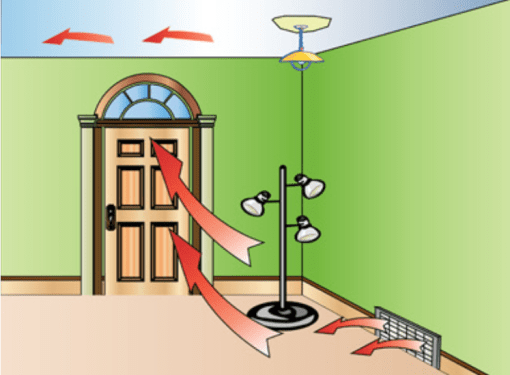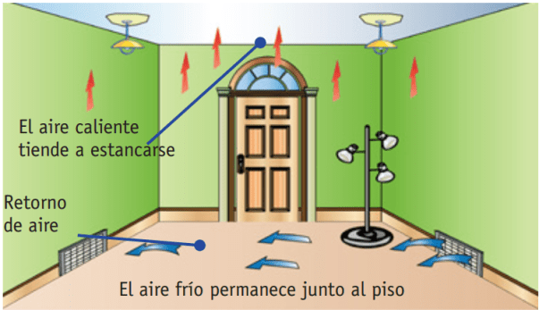 En los sistemas de calefacción, el aire se introduce en la habitación lo más cerca posible del suelo. Como el aire caliente se eleva, se forman unas ligeras corrientes que hacen circular el aire caliente por todas partes de la habitación, tal como puede verse en la Figura 2. El aire es retornado a la caldera a través de una abertura situada también lo más cerca posible del suelo y del lado opuesto de la salida de aire caliente.