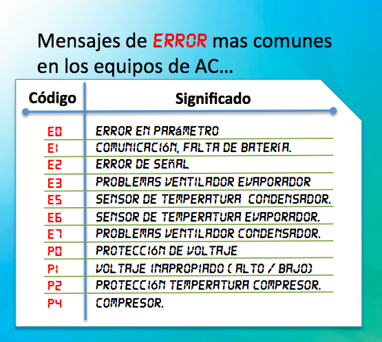 Otros equipos tendrán otra nomenclatura según el tipo de falla aquí les dejamos código de falla, recuerda todos los fabricantes tiene su alarma de falla por eso es necesario saber el modelo del equipo y marca.