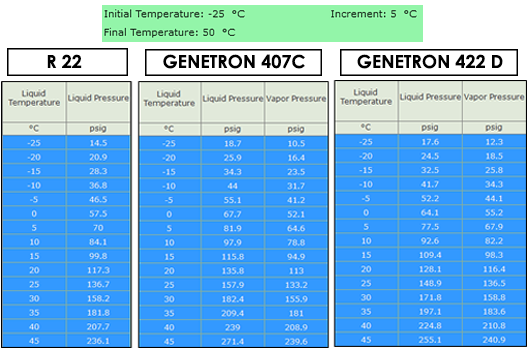 El refrigerante juega un papel muy importante en cualquier sistema, llámese de refrigeración de alimentos, confort humano, conservación de alimentos o ultra congelación, entre otros. Hablar de las presiones de trabajo y las temperaturas en los sistemas, será distinto de acuerdo a su aplicación. Aunque un refrigerante pueda trabajar para distintas temperaturas, las presiones no serán las mismas; Por ejemplo las opciones de reemplazo para un sistema de confort que trabaja con su refrigerante original R 22, son, Genetron 422D o Genetron 407C, de acuerdo a las presiones y temperaturas de trabajo en el sistema, el refrigerante tendrá el mismo comportamiento, o debería tener el mismo comportamiento de trabajo (presiones). Si se tiene un sistema de R 22 AC, para temperatura ambiente de confort, las presiones mínimas y máximas que podemos tomar en un rango, son -25°C a 50°C con incrementos de temperatura de 5°C.