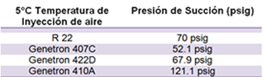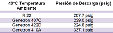 Como se observa en las tablas de temperatura VS presión, en este ejemplo si tomamos la temperatura de 5°C, tendremos presiones muy parecidas, excepto en el Genetron 410A, este refrigerante también figura para el mercado de AC de confort, la presión en este caso se incrementa a un 60% en relación al R 22 del sistema.