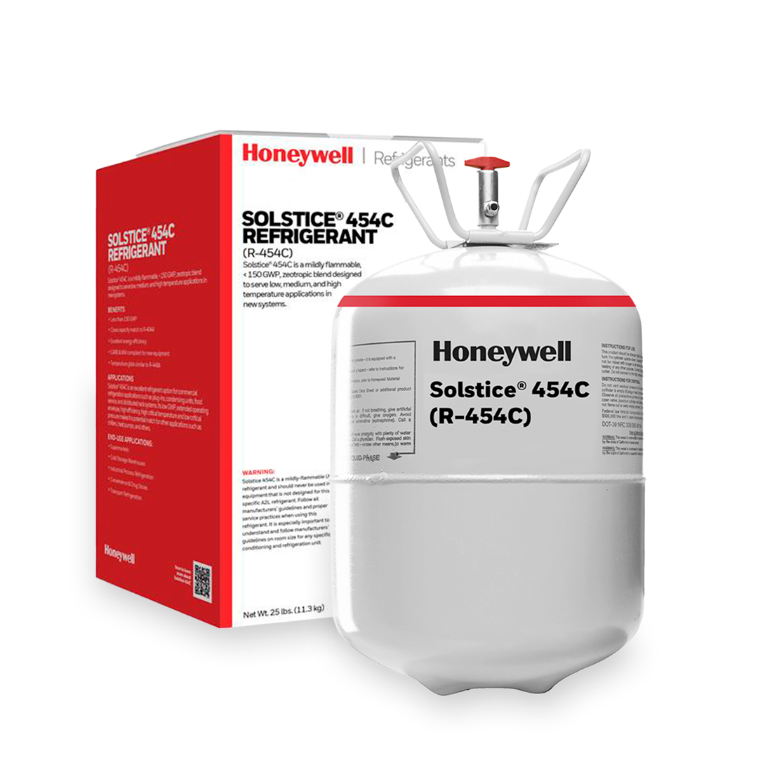 Solstice 454C es una mezcla no azeotrópica compuesta por R-1234yf y R-32, clasificada como A2L (baja toxicidad y flamabilidad leve). Esta combinación ofrece un excelente desempeño térmico con un GWP de solo 146, lo que lo convierte en una de las opciones más ecológicas disponibles.