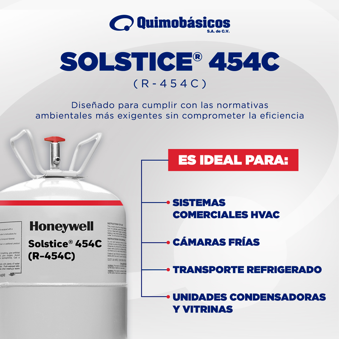 Solstice® 454C es un refrigerante de bajo GWP (Potencial de Calentamiento Global), desarrollado por Honeywell y comercializado en México por la red de distribuidores de Quimobásicos. Diseñado para cumplir con las normativas ambientales más estrictas, este gas no solo es sustentable, sino que también mantiene una alta eficiencia y desempeño operativo.