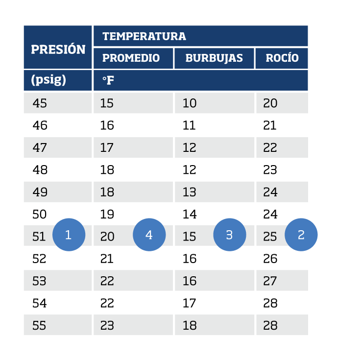 En esta tabla de Honeywell Solstice N40 PT, si se desea alcanzar una temperatura promedio de bobina de 20° F, como se nota en el número (4). Usando la tabla como referencia, nosotros sabemos que podemos empezar por medio de la configuración de la presión de 52 psig(19).