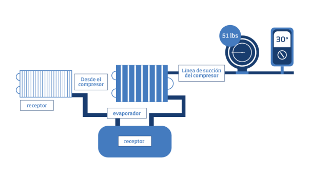En condición para configurar el sobrecalentamiento, se encuentra la temperatura del punto de Rocío correspondiente a la bobina de presión. La presión de la bobina de evaporación y la temperatura de rocío como son mostrados en los números 1 y 2 en la tabla anterior. Para alcanzar el sobrecalentamiento se compara con la temperatura de rocío de la tabla anterior para la tubería de salida. La diferencia en estas dos se encuentra en las temperaturas del sobrecalentamiento. En este ejemplo, cuando la temperatura es 51 psig y la temperatura de la turbina es de 30 grados, el sobrecalentamiento será de 30 menos 25, o 5 grados. Al momento de continuar para tomar las lecturas de temperaturas, se puede ajustar al sobrecalentamiento y la presión como se necesite hasta que haya alcanzado la temperatura deseada la bobina.