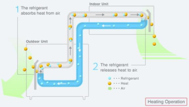 El uso común de los refrigerantes en un aire acondicionado es para transferir el calor de adentro y mandarlo afuera. En el caso de la bomba de calor el refrigerante actúa para transferir el calor de afuera hacia adentro hasta calentar el aire de la habitación.