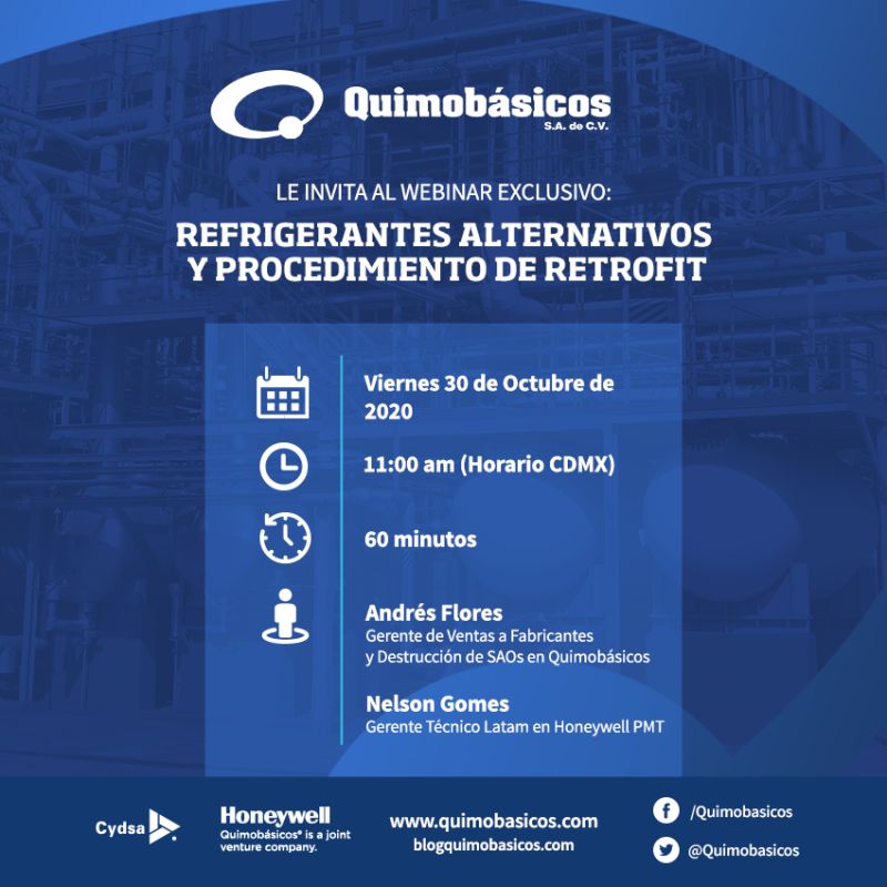 Participa en el Webinar Gratuito sobre «Refrigerantes Alternativos y Procedimientos de Retrofit», suscríbete en el enlace que anexamos en la sección inferior y te esperamos este viernes 30 de Octubre en punto de las 11:00 am (Hora de la CDMX) en Zoom.
