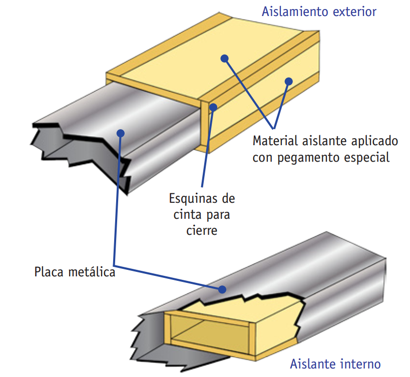 En toda instalación de aire acondicionado deben tomarse toda clase de precauciones para evitar que el aire en circulación pueda absorber calor. Esto significa que un sistema de distribución debe estar diseñado de manera que los desplazamientos del aire enfriado sean lo más cortos posible y los ductos estén muy bien aislados en toda su longitud. En la Figura 1 puede verse el aislante aplicado por la parte exterior de la conducción y también aparece aplicado interiormente.