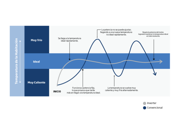 En los aires acondicionados convencionales el compresor siempre se encuentra funcionando al 100% de su capacidad. Por ejemplo, si encendemos un aire acondicionado convencional en temporada de verano y ajustamos la temperatura a 23°C y la temperatura del área externa se encuentra en 30°C, el sistema convencional encenderá el compresor a su máxima potencia al momento comenzar a trabajar, y se apagara cuando llegue a la temperatura que se ajustó, en este caso de 23°C. Al momento de subir de nuevo la temperatura interior, el compresor volverá a arrancar al 100% de su capacidad hasta volver a llegar a la temperatura deseada. Este proceso se repetirá mientras el aire acondicionado se encuentre encendido. Es importante recordar que los mayores picos de consumos energéticos en un sistema de refrigeración se producen al momento de encender el compresor.