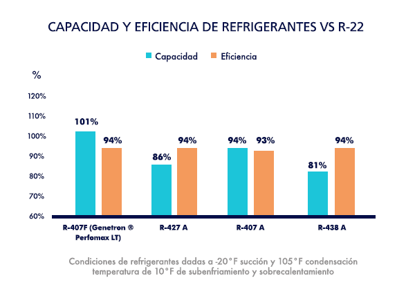 El refrigerante R-407F (Genetron® Performax LT) es el que presenta mejor capacidad y eficiencia en esta prueba, esto se debe a que no requiere ajustar ni reemplazar la válvula de expansión, por consecuencia este refrigerante trabaja manteniendo el mismo caudal del refrigerante.