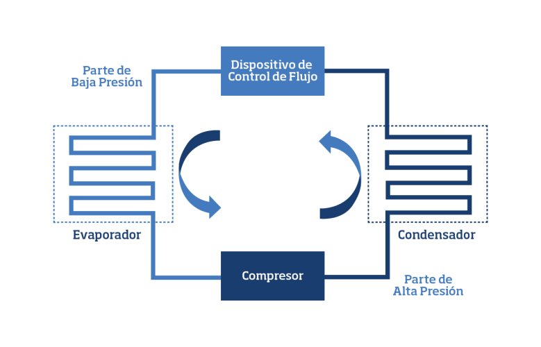 ¿Qué son los dispositivos de control de flujo? Son aquellos componentes del sistema de refrigeración encargados de regular el flujo del refrigerante líquido en los evaporadores. Son conocidos por dividir el sistema de refrigeración, al igual que el compresor, en la parte de alta presión y de baja presión.