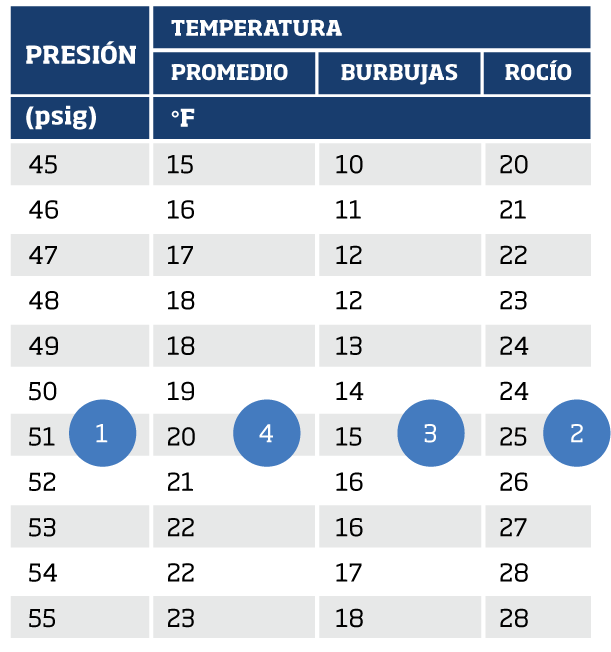 En esta tabla de Honeywell Solstice N40 PT, si se desea alcanzar una temperatura promedio de bobina de 20° F, como se nota en el número (4). Usando la tabla como referencia, nosotros sabemos que podemos empezar por medio de la configuración de la presión de 52 psig(19).