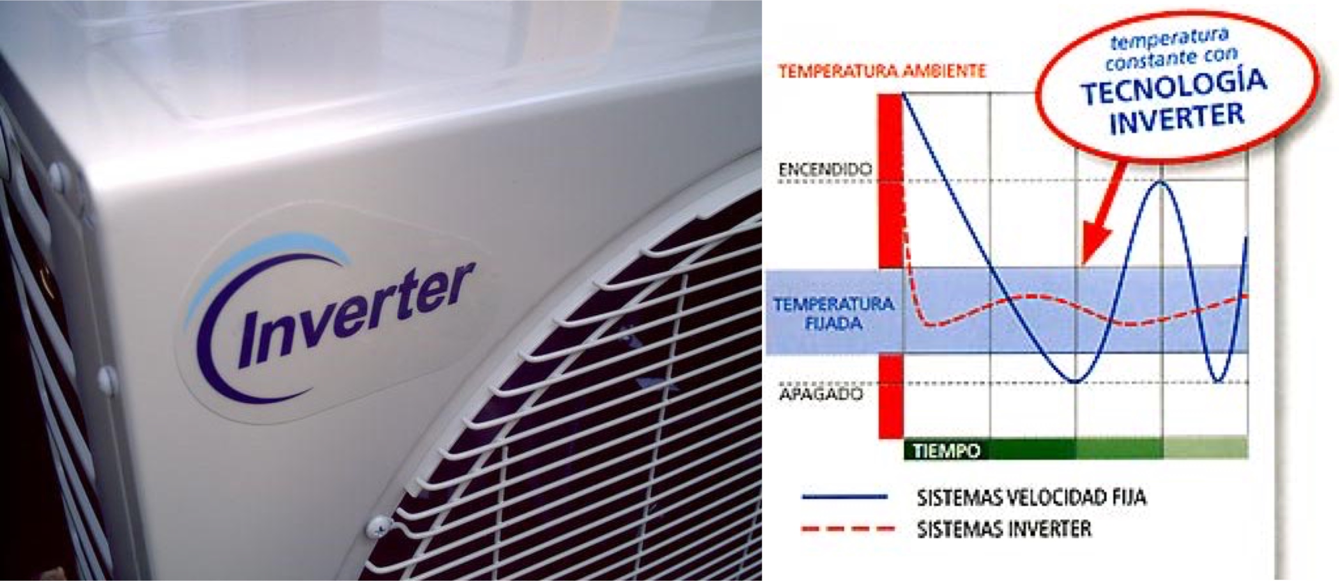 En las máquinas convencionales el compresor está funcionando siempre al 100% de su capacidad, ejemplo, en verano al prender un sistema convencional y a justar la temperatura de 23°C y la temperatura del área se encuentra en 30°C, el sistema convencional estará trabajando a su máxima capacidad y se apagara cuando llegue a la temperatura que se ajustó 25°C.