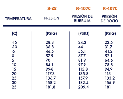 Comparativa de Tablas de Presión Temperatura de R22 vs R407C